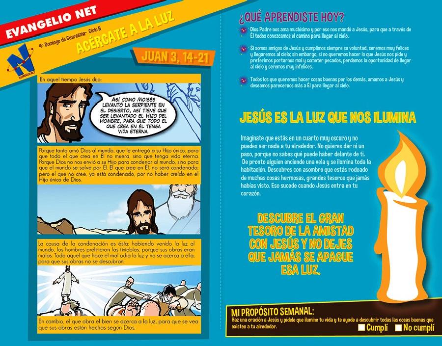 Juan 3, 14- 21 para niños. 9 de Marzo de 2018 Dios nos habla a todos, sin importar nuestra edad o condición social. Conoce lo que él tiene hoy para decirte. Síguenos en nuestra FAN PAGE de FACEBOOK PARROQUIA NUESTRA SEÑORA DE TORCOROMA BOGOTÁ Like 0 Dislike 0 Otros artículosNovena de Aguinaldos y su origen. Horario13 de Diciembre de 2025Las novenas, o novenario es una costumbre muy antigua que tiene sus raíces en la época colonial. Nota doctrinal sobre los títulos marianos: La Madre del Pueblo Fiel, no Corredentora4 de Noviembre de 2025El documento del Dicasterio para la Doctrina de la Fe aprobado por León XIV aclara los apelativos que deben usarse para...