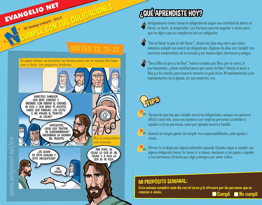 Mateo 22,15-21 para niños- 17 de Octubre de 2014 Dios nos habla a todos, sin importar nuestra edad o condición social. Conoce lo que él tiene hoy para decirte. Like 1 Dislike 0 Otros artículosNovena de Aguinaldos y su origen. Horario13 de Diciembre de 2025Las novenas, o novenario es una costumbre muy antigua que tiene sus raíces en la época colonial. Nota doctrinal sobre los títulos marianos: La Madre del Pueblo Fiel, no Corredentora4 de Noviembre de 2025El documento del Dicasterio para la Doctrina de la Fe aprobado por León XIV aclara los apelativos que deben usarse para...