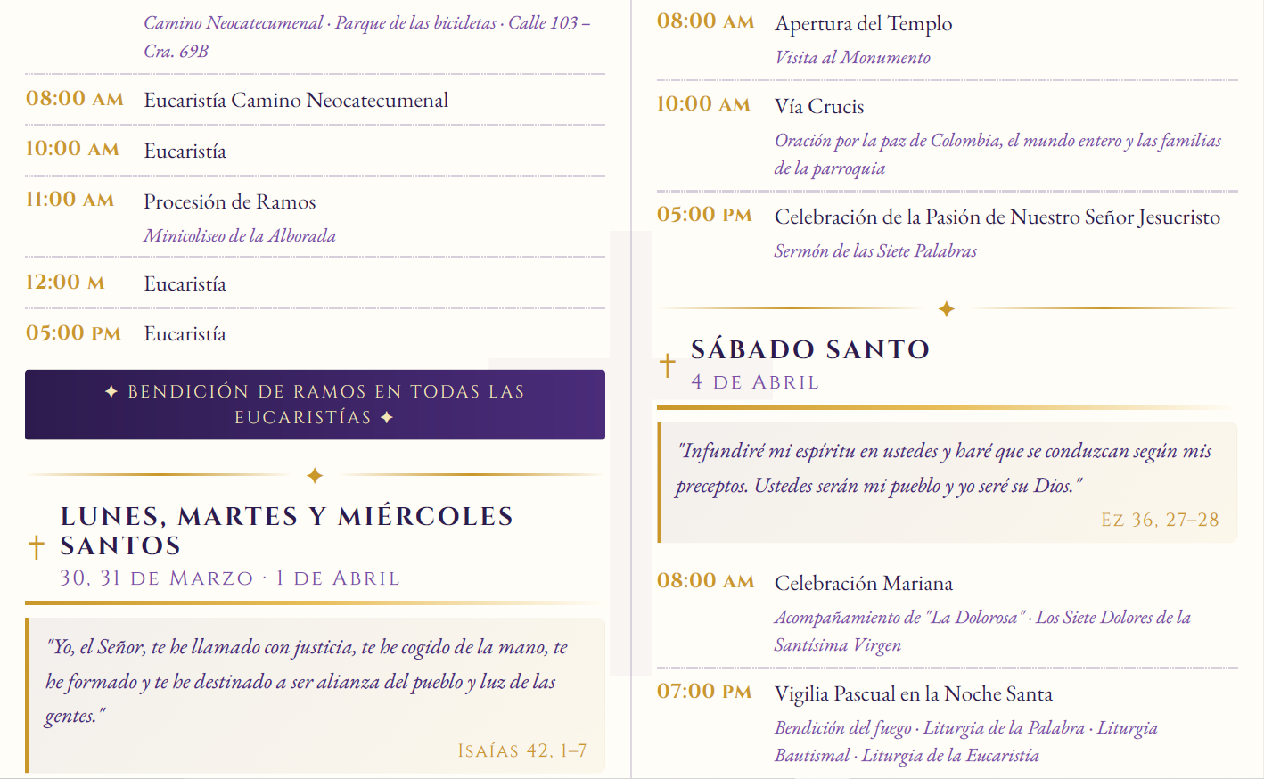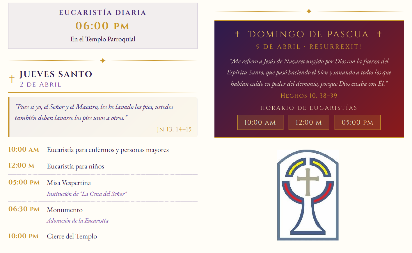 BoletinesPrograma Semana Santa 2026 - 29 de marzo al 5 de abril18 de Marzo de 2026Compartimos a toda la comunidad parroquial el programa para la Celebración de la Semana Santa de este 2026. Los invitamos a participar activamente en familia con mucha fe Descargue el boletín aquí Like 0 Dislike 0
