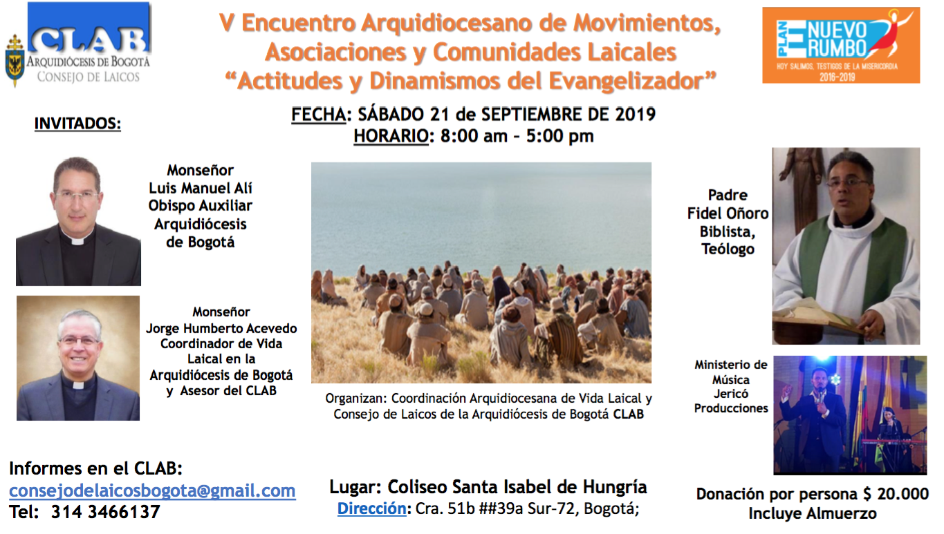 Centro de información Yo quiero Noticias Boletines Eventos Artículos Canonización Mensajes del Señor Cardenal Cartas pastorales Homilías Mensajes La voz del pastor Documentos del Vaticano NoticiasActitudes y dinamismos del evangelizador18 de Septiembre de 2019Encuentro anual de los laicos provenientes de las diferentes asociaciones y movimientos laicales de la arquidiócesis de BogotáDirigido a: Miembros de movimientos y… Like 0 Dislike 0 Noticias relacionadas Mensaje de Mons. Edwin Vanegas Cuervo, obispo auxiliar de Bogotá La Santa Misa en Semana Santa La Arquidiócesis de Bogotá celebra el nombramiento de Monseñor Paolo Rudelli en la Santa Sede