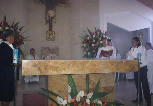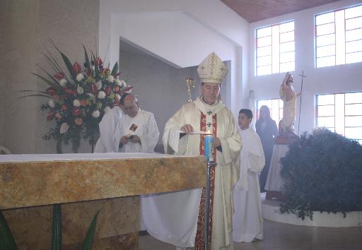 Luego el Obispo lo unge con el santo crisma (aceite) las cinco cruces grabadas en la piedra, que representan las cinco llagas de Nuestro Señor Jesucristo” e inciensa en repetidas ocasiones quedando este altar bendito allí se introducen las reliquias.