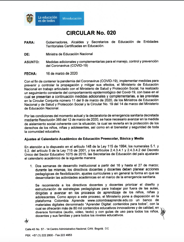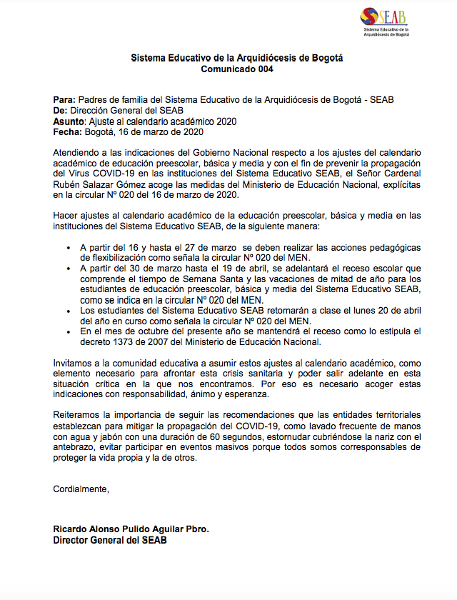El SEAB informa a los padres de familia, y a la comunidad académica, las disposiciones del Ministerio de Educación Nacional sobre los cambios en el calendario académico