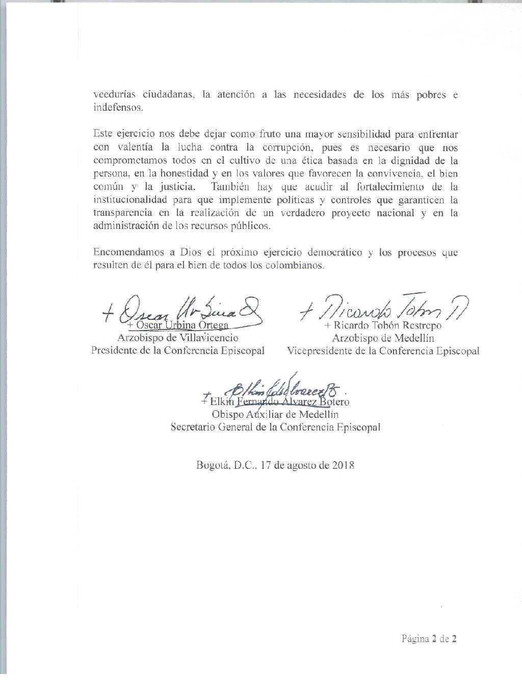 Centro de información Yo quiero Noticias Boletines Eventos Artículos Canonización Mensajes del Señor Cardenal Cartas pastorales Homilías Mensajes La voz del pastor Documentos del Vaticano NoticiasIglesia católica anima a luchar contra la corrupción22 de Agosto de 2018Los obispos católicos del país hacen un llamado a todos los colombianos a luchar contra la corrupción en todas sus formas. Así lo manifestaron, a través de un comunicado… Imagen: https://mioriente.com/ Like 0 Dislike 0 Noticias relacionadas Mensaje de Mons. Edwin Vanegas Cuervo, obispo auxiliar de Bogotá La Santa Misa en Semana Santa La Arquidiócesis de Bogotá celebra el nombramiento de Monseñor Paolo Rudelli en la Santa Sede