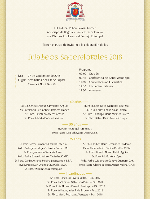 Centro de información Yo quiero Noticias Boletines Eventos Artículos Canonización Mensajes del Señor Cardenal Cartas pastorales Homilías Mensajes La voz del pastor Documentos del Vaticano NoticiasJubileos Sacerdotales 201825 de Septiembre de 2018 Like 0 Dislike 0 Noticias relacionadas Mensaje de Mons. Edwin Vanegas Cuervo, obispo auxiliar de Bogotá La Santa Misa en Semana Santa La Arquidiócesis de Bogotá celebra el nombramiento de Monseñor Paolo Rudelli en la Santa Sede