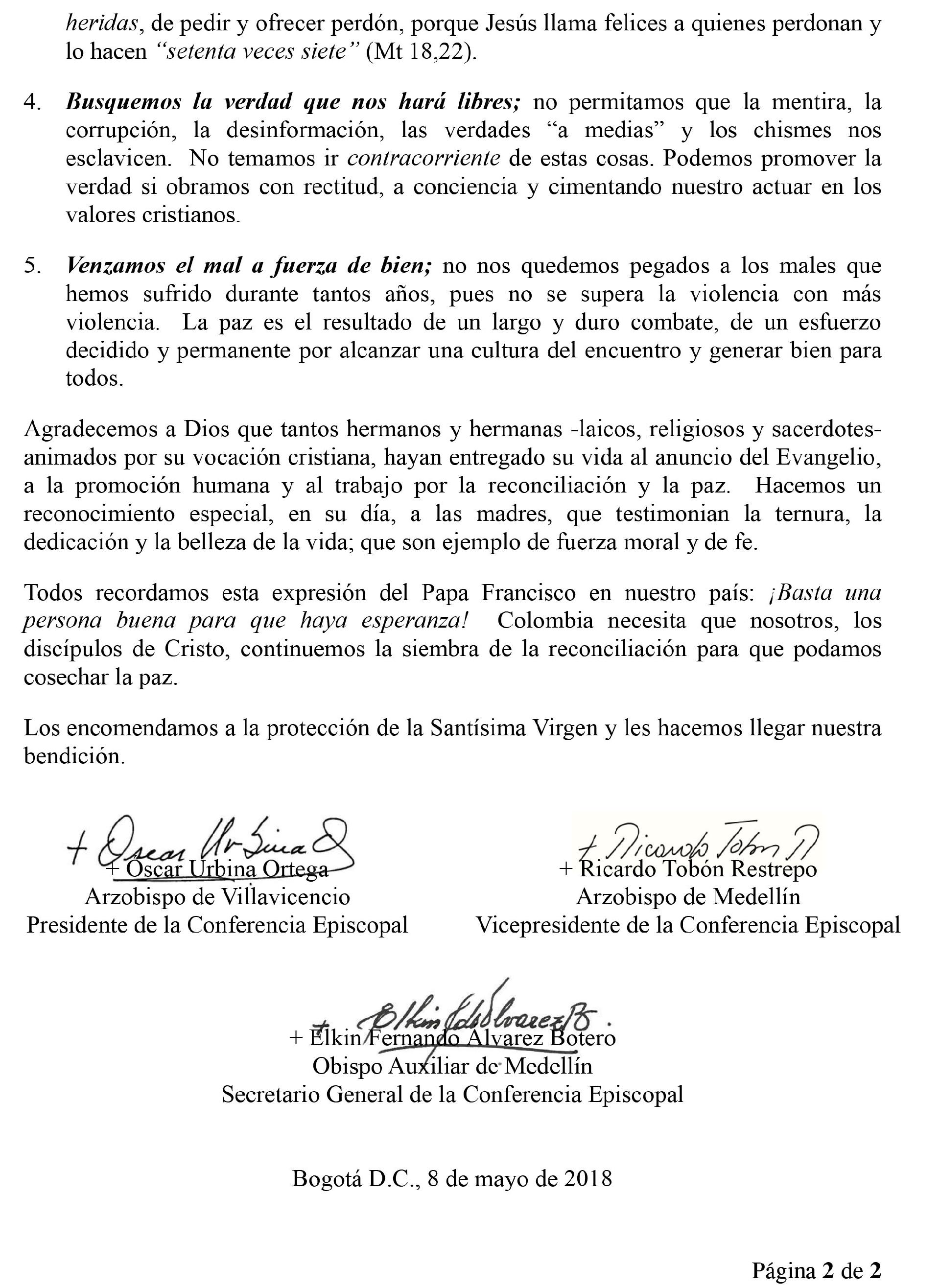 A continuación, el mensaje completo de los obispos a los fieles católicos de Colombia: