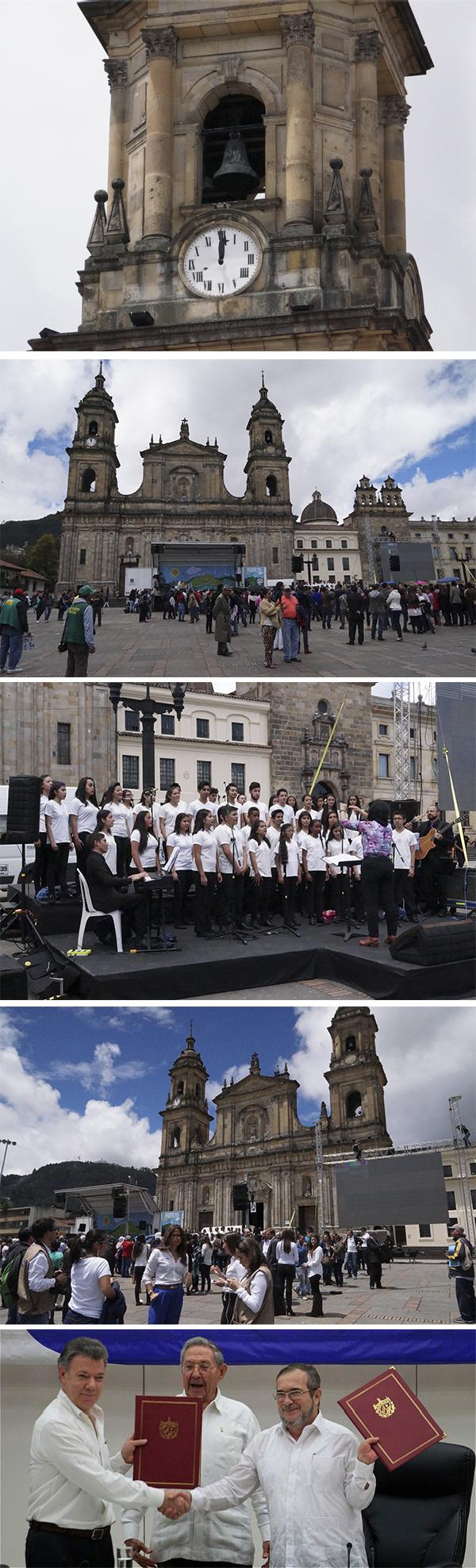 La plaza de Bolívar en el centro de la capital de Colombia se vistió de fiesta; un sol radiante de medio día ,reporteros, medios de comunicación, grupos musicales, transeúntes, vendedores ambulantes y por supuesto las frecuentes palomas llenaron la plaza, mientras  el sonido de las campanas  anunciaban un hecho sin precedentes, un logro esperado desde hace 50 años, la tan anhelada paz para Colombia.