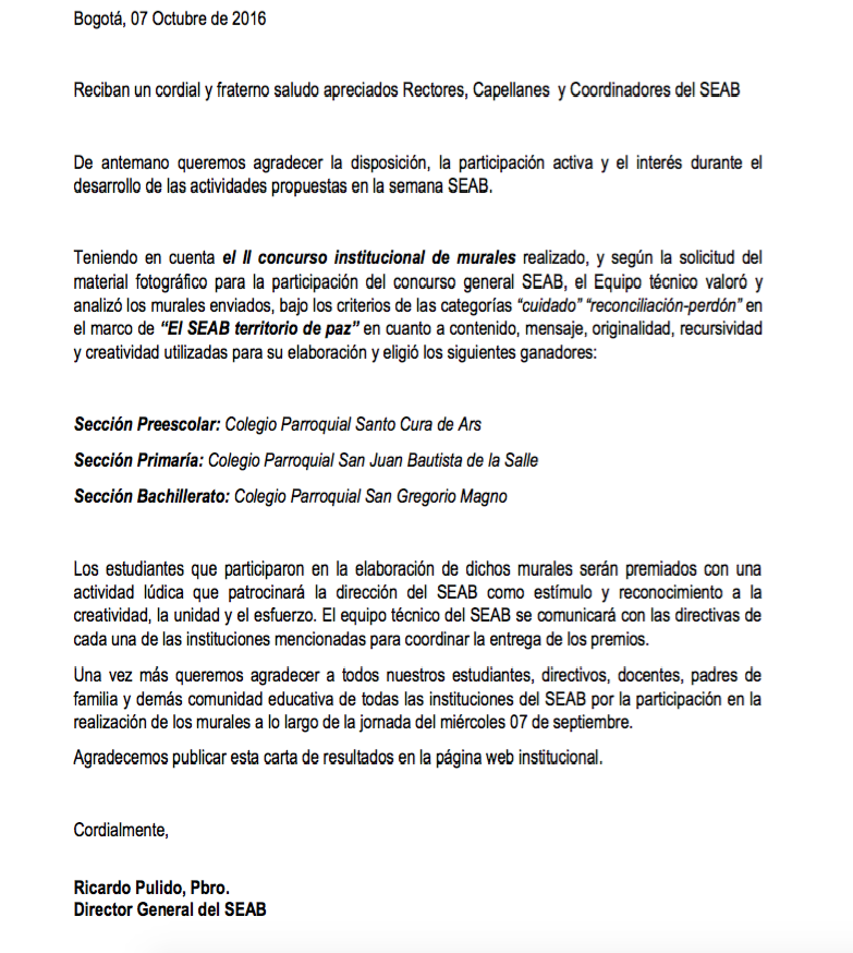 Centro de información Yo quiero Noticias Boletines Eventos Artículos Canonización Mensajes del Señor Cardenal Cartas pastorales Homilías Mensajes La voz del pastor Documentos del Vaticano NoticiasMurales ganadores II concurso13 de Octubre de 2016 Like 0 Dislike 0 Noticias relacionadas Mensaje de Mons. Edwin Vanegas Cuervo, obispo auxiliar de Bogotá La Santa Misa en Semana Santa La Arquidiócesis de Bogotá celebra el nombramiento de Monseñor Paolo Rudelli en la Santa Sede