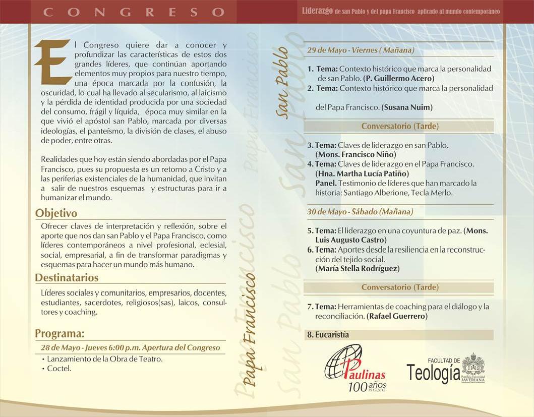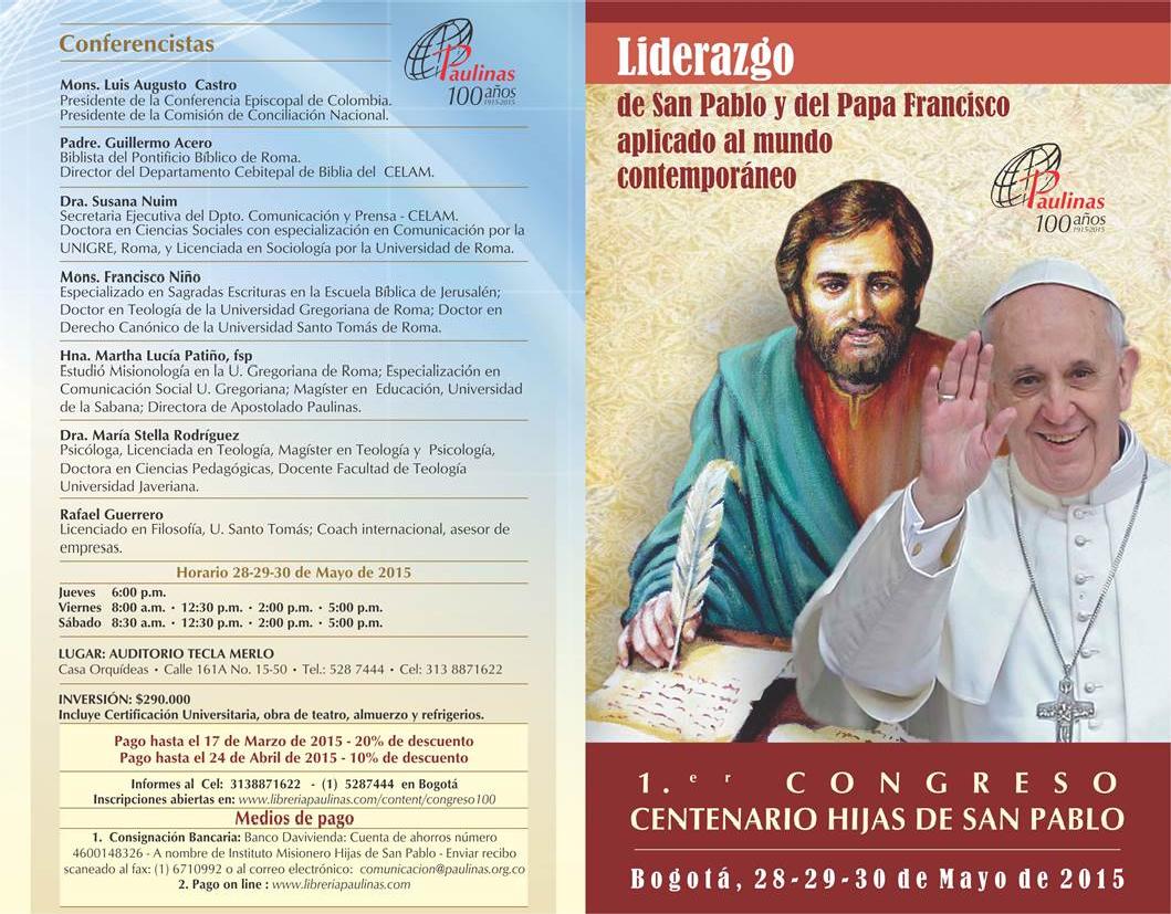 Centro de información Yo quiero Noticias Boletines Eventos Artículos Canonización Mensajes del Señor Cardenal Cartas pastorales Homilías Mensajes La voz del pastor Documentos del Vaticano NoticiasPrimer Congreso: Liderazgo de San Pablo y del Papa Francisco aplicado al mundo contemporaneo27 de Mayo de 2015Para mayor información haz clink en el siguiente link: http://libreriapaulinas.com/congreso Like 0 Dislike 0 Noticias relacionadas Tiempo para nutrir, cuidar y testimoniar la fe La Arquidiócesis de Bogotá celebró la ordenación de nuevos sacerdotes y diáconos Ordenaciones en la Catedral Primada de Colombia