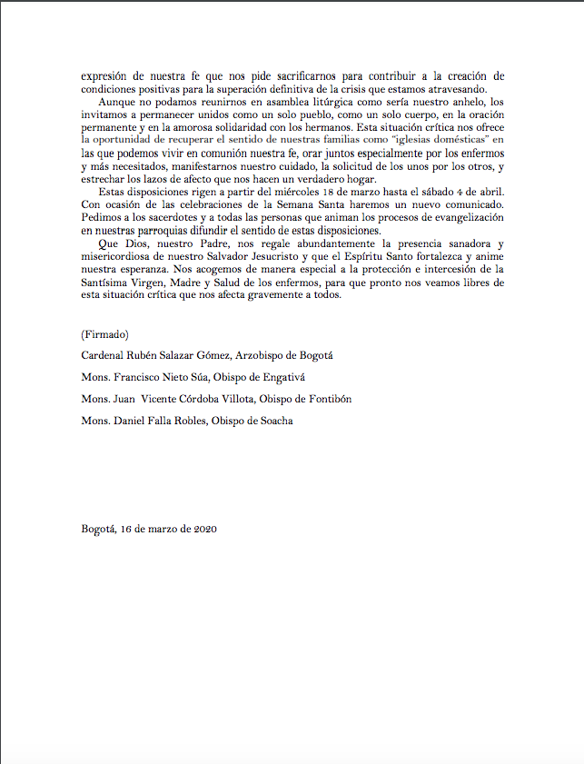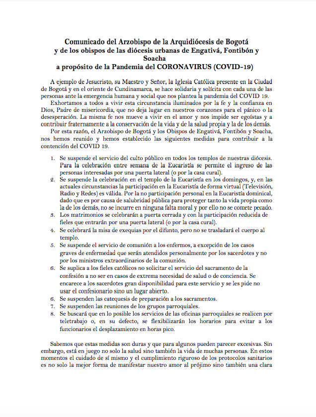 Centro de información Yo quiero Noticias Boletines Eventos Artículos Canonización Mensajes del Señor Cardenal Cartas pastorales Homilías Mensajes La voz del pastor Documentos del Vaticano NoticiasSe suspende el servicio del culto público en todos los templos de Bogotá16 de Marzo de 2020Los obispos de las diócesis del territorio metropolitano de Bogotá (Engativá, Soacha y Fontibón) han dado a conocer un comunicado sobre la suspensión del culto público… Like 0 Dislike 0 Noticias relacionadas La Santa Misa en Semana Santa La Arquidiócesis de Bogotá celebra el nombramiento de Monseñor Paolo Rudelli en la Santa Sede Prográmate