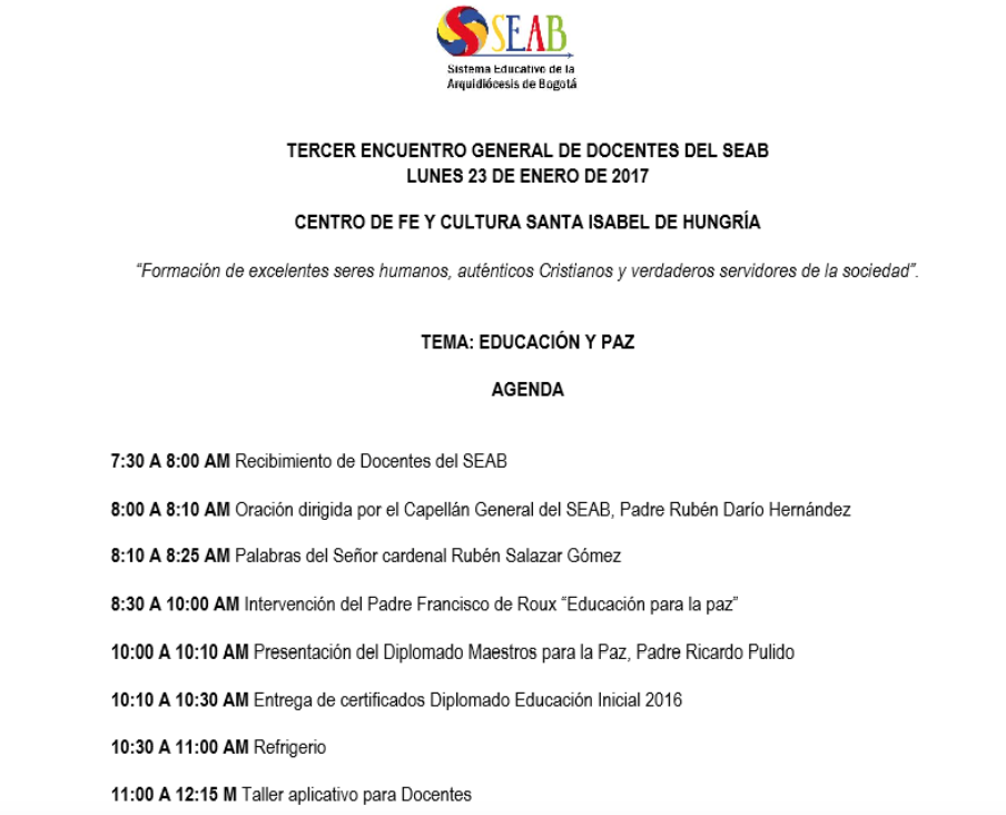 Centro de información Yo quiero Noticias Boletines Eventos Artículos Canonización Mensajes del Señor Cardenal Cartas pastorales Homilías Mensajes La voz del pastor Documentos del Vaticano NoticiasTercer encuentro general de docentes SEAB20 de Enero de 2017 Like 0 Dislike 0 Noticias relacionadas Mensaje de Mons. Edwin Vanegas Cuervo, obispo auxiliar de Bogotá La Santa Misa en Semana Santa La Arquidiócesis de Bogotá celebra el nombramiento de Monseñor Paolo Rudelli en la Santa Sede